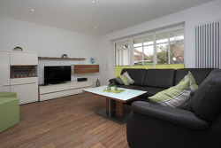 - Wohnbereich: Großzügiger Wohnbereich mit gemütlichem Ledersofa, Flachbild-TV, DVD-Player, Musikanlage sowie Büchern und Spielen für kleine und große Gäste.